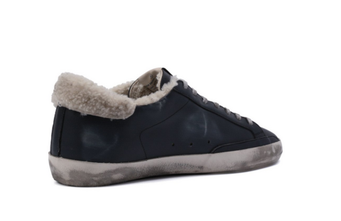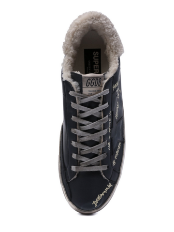 Темно-синие кеды Superstar объединили в себе комфорт спортивной обуви и согревающие свойства зимней. Представленную эксклюзивно в ЦУМе модель из мягкой матовой кожи утеплили густой овчиной. Заданное потертостями расслабленное настроение поддерживают надписи в стиле граффити.
