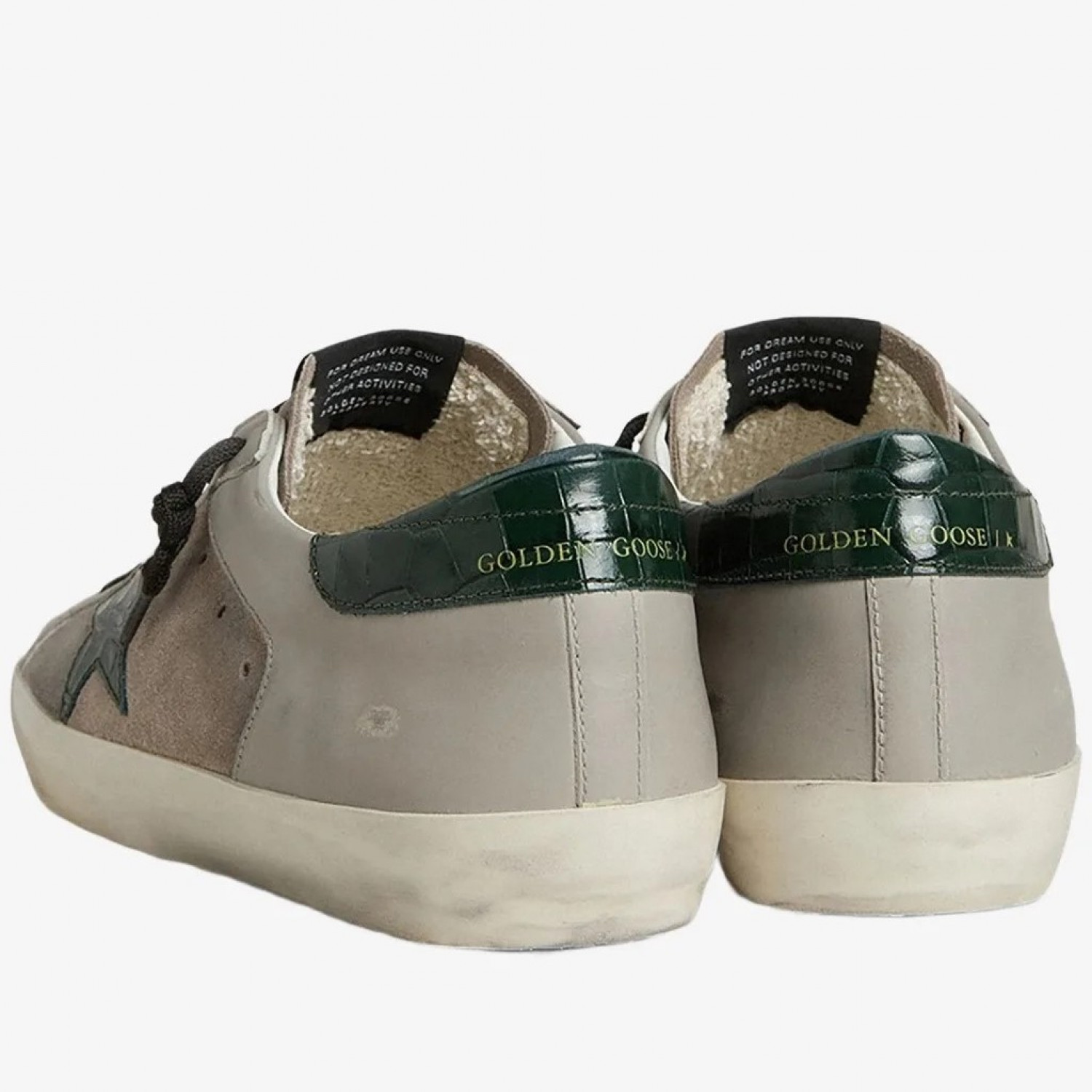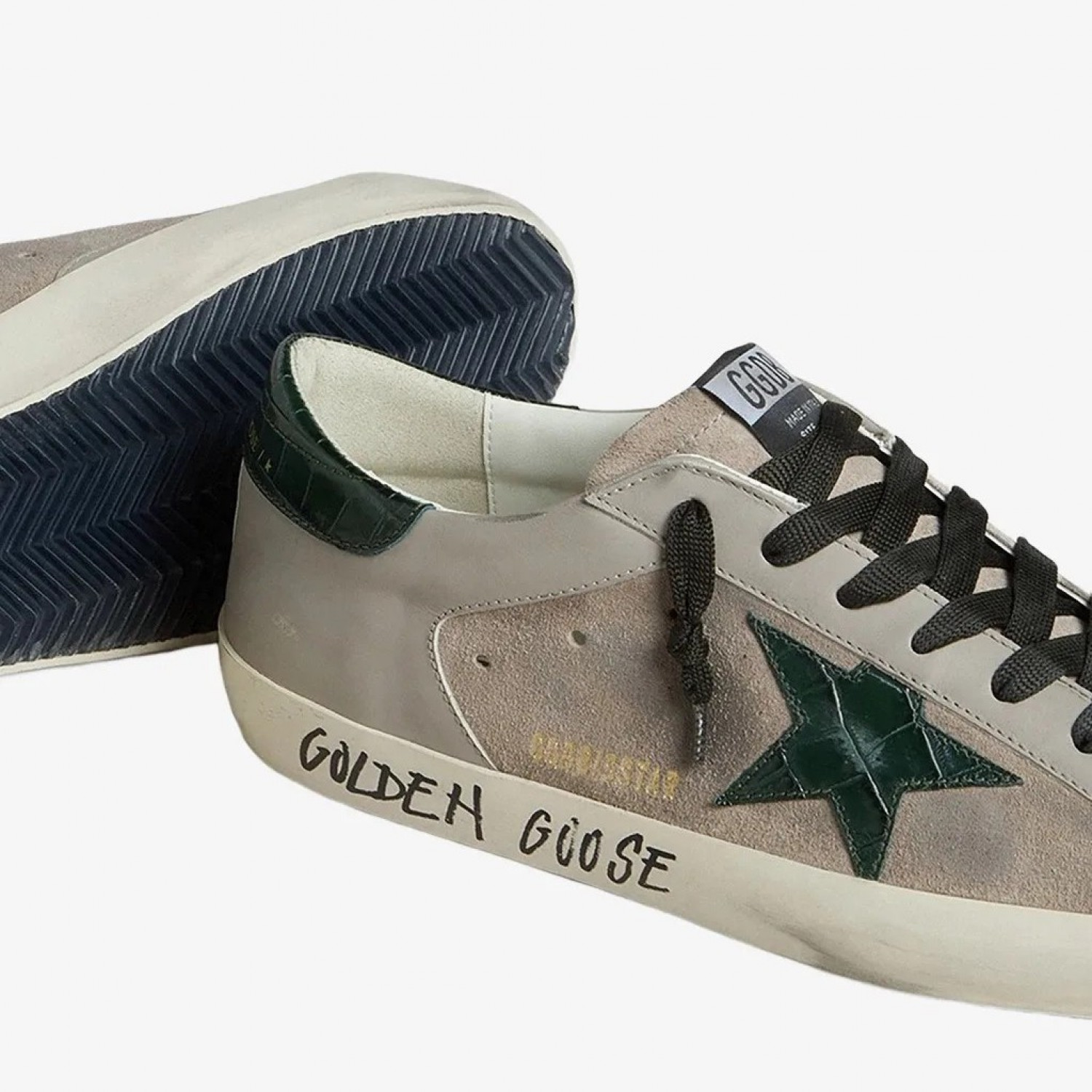 Эти мужские кеды Golden Goose Super-Star — образец контрастного сочетания благородной бежевой замши и матовой светло-серой кожи наппа. Главный акцент модели — звезда и задник (heel tab), выполненые из зеленой кожи с эксклюзивной тисненой текстурой «крокодил» — редкое решение, которое подчеркивает статус, вкус владельца и принадлежность к лимитированной или эксклюзивной коллекции (LDT).