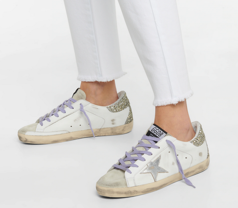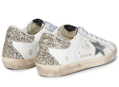 Кроссовки Superstar от Golden Goose — обязательное дополнение к любой обуви. Сделанные в Италии из белой кожи, эти низкие кеды предварительно потерты, чтобы придать им подлинный винтажный вид, а серебристые аппликации в виде звезд и контрастные блестящие туфли на каблуке придают классический стиль.