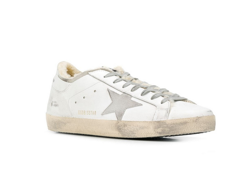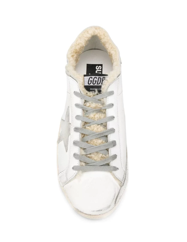 Женские кеды Golden Goose Deluxe Brand, модель «Superstar». Кроссовки выполнены из белой кожи с фирменным эффектом состаренной кожи. При изготовлении использовались исключительно натуральные материалы такие, как кожа и хлопок. Форма носка закругленная.