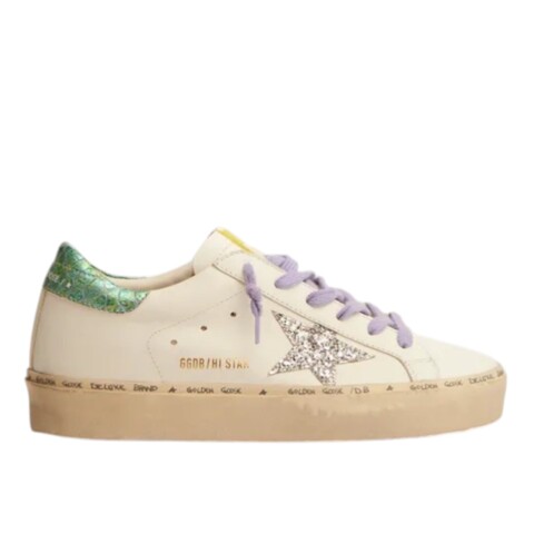 Двойная высота и культовый дизайн: кроссовки Hi Star, вдохновленные нашими кроссовками Super-Star, украшены двойной окантовкой и надписью от руки. Эта модель из белой кожи украшена блестящей серебряной звездой и петлей из кожи цвета морской волны цвета змеи на пятке. А сиреневые кружева добавляют завершающий штрих цвета.