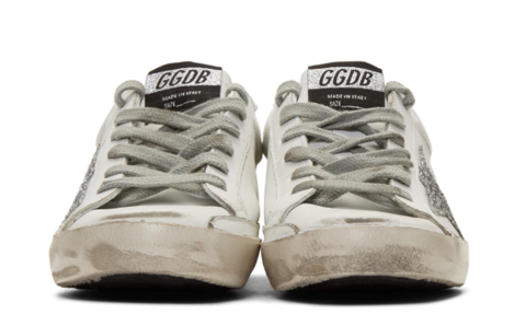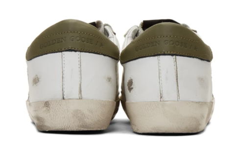 Низкие кроссовки ручной работы из полированной кожи теленка белого цвета. Повсюду грязные и неприятные. Круглый носок. Застежка на шнуровке серого цвета. Текстильная нашивка с логотипом на мягком язычке. Мягкий воротник. Подкладка из махровой ткани и кожи. Перфорированные детали по бокам. Золотистая печать с логотипом на внешней стороне. Фирменная блестящая звездная аппликация серебристого цвета с внешней стороны. Тисненый логотип на кожаном каблуке цвета хаки. Резиновая межподошва кремового цвета. Прорезиненная резиновая подошва черного цвета.