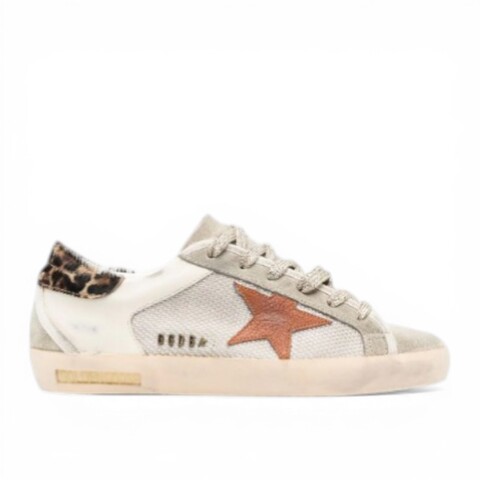 Серо-бежевый, телячья кожа, леопардовый принт, нашивка в форме звезды, контрастные вставки, контрастный задник с логотипом, закругленный носок, шнуровка спереди, стелька с логотипом и резиновая подошва.